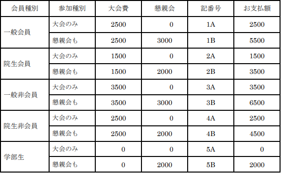 | 事前振込 | 一般会員 | 2500円 | 院生会員 | 1500円 | 学部生会員 | 無料 |